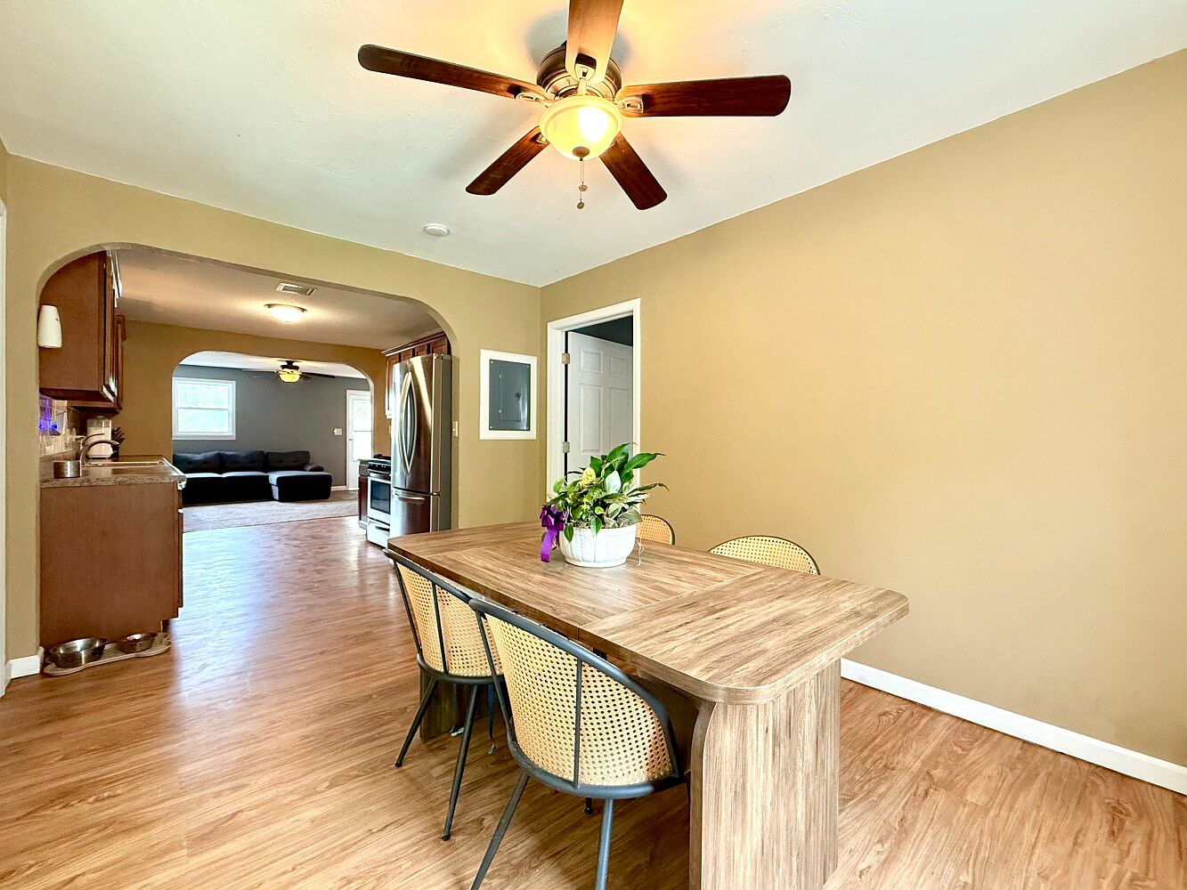 This cozy dining area features a simple rectangular wooden table surrounded by four cane-back chairs with black metal frames. A small plant centerpiece adds a touch of greenery. Warm beige walls complement the light wood-toned flooring, creating a welcoming atmosphere. The ceiling fan, with dark wooden blades and a warm light fixture, adds functionality and style. Through two gracefully curved archways, the kitchen and living area are visible. The kitchen showcases medium-tone wood cabinetry and stainless steel appliances, while the adjoining living room reveals a dark sectional sofa accentuating the open-concept layout.