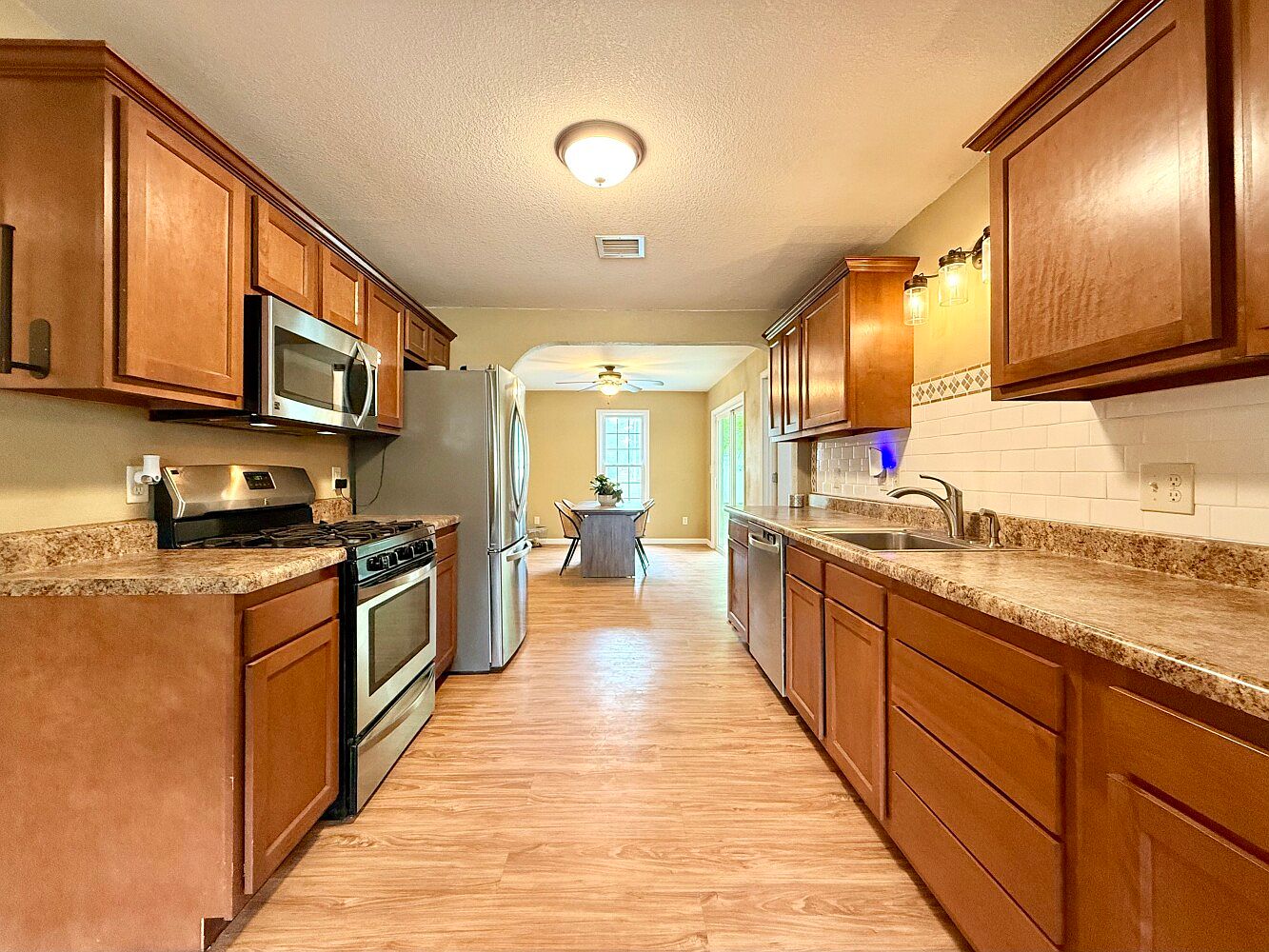 This kitchen features a galley layout, efficiently utilizing the space with cabinetry and appliances on both sides. Warm wooden cabinets with a subtle grain provide a rich, natural tone that contrasts softly with the cream-colored walls and faux granite countertops. Stainless steel appliances including a microwave, stove, refrigerator, and dishwasher add modern convenience to the traditional cabinetry. Light wood-style flooring runs throughout, seamlessly connecting the kitchen to the adjoining dining area, which is illuminated by natural light from large windows. The dining space offers a cozy atmosphere, enhanced by a ceiling fan and simple decor, perfect for casual meals.