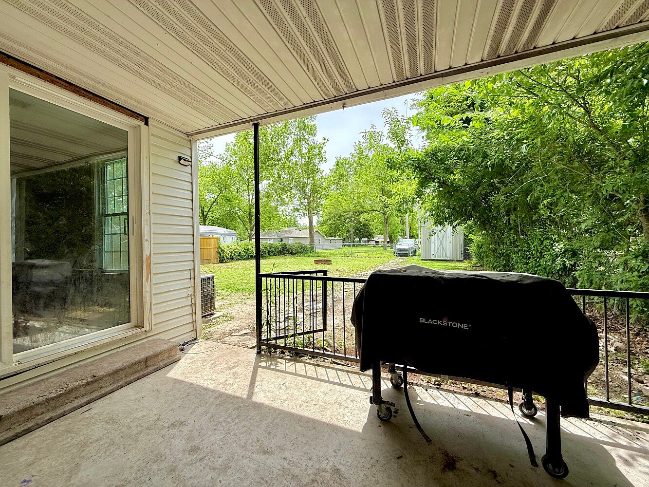 This covered patio provides a sheltered space opening to a spacious backyard filled with mature green trees and open grassy areas. The ceiling features a white perforated panel design, adding subtle texture overhead. Concrete flooring offers durability suitable for outdoor use, complemented by a black wrought iron railing enclosing the patio and a gate leading to the yard. A large sliding glass door connects the interior living space with this outdoor area. A Blackstone grill, protected by a black cover, stands ready for cookouts, making this a versatile and inviting spot for outdoor dining and relaxation.