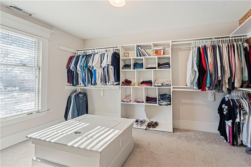 This walk-in closet features a bright and airy layout with a spacious design that maximizes storage and organization. Soft neutral walls and light carpeting create a calm atmosphere, enhanced by natural light streaming through a large window with white blinds. The closet is lined with multiple hanging rods, neatly holding an array of shirts and sweaters in coordinated colors, predominantly blues, grays, and neutrals. Central shelving units with open cubbies offer folded clothing storage, while a sizable white island in the center provides additional surface space and storage beneath. Crown molding and clean white trim contribute to the polished, functional aesthetic.