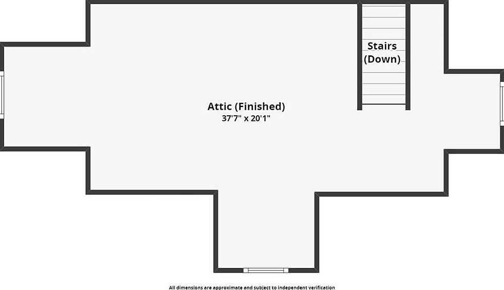 This spacious finished attic spans approximately 37 feet 7 inches by 20 feet 1 inch, offering a versatile open layout. The floor plan reveals a main central space with three distinct alcoves projecting outward, allowing for creative use such as seating areas, office nooks, or storage. Access to the attic is provided via stairs descending from the upper right side of the space. The clean, straightforward design maximizes usable area, emphasizing functionality while maintaining an open feeling ideal for a variety of purposes, from a playroom to a cozy retreat or home office.