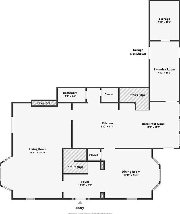 This floor plan reveals a spacious main level designed for both comfort and functionality. To the left, the expansive living room boasts dimensions of 18’11” by 25’10”, featuring a fireplace that likely serves as a cozy focal point. Adjacent is a compact bathroom for convenience. The kitchen, measuring 16’10” by 11’11”, is centrally located and connects directly to a breakfast nook, creating a warm, inviting space for casual dining. The dining room lies to the right, offering a bay window area for natural light and visual interest. A foyer and staircases provide smooth transitions between areas, while closets ensure ample storage. The plan also includes a laundry room and additional storage space near the garage, enhancing utility without sacrificing design flow.