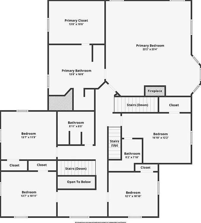 This floor plan reveals a thoughtfully designed second level featuring a spacious primary bedroom measuring 23’2″ by 23’4″ with an adjacent fireplace and two closets for ample storage. The primary suite also includes a large bathroom and a dedicated walk-in closet space. Four additional bedrooms are comfortably spaced across the floor, each equipped with closets to maximize storage options. Separate bathrooms are placed strategically near the bedrooms, including a centrally located one accessible to most rooms. Two staircases offer flexible access to other levels, with an open area overlooking the floor below that adds architectural interest and openness to the layout.