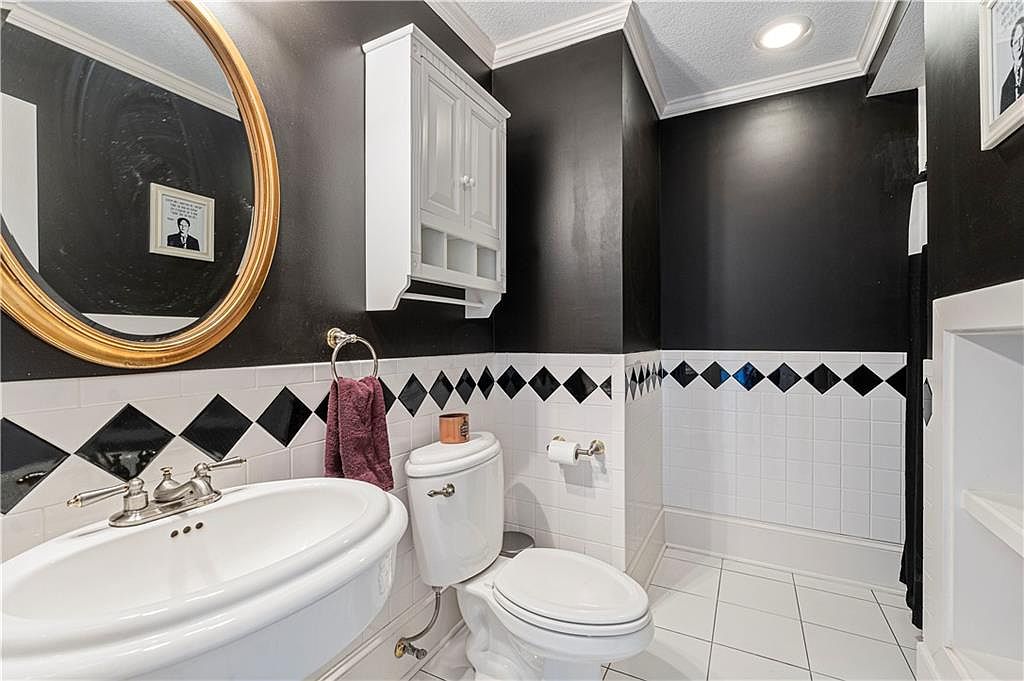 This compact bathroom features a striking contrast of dark black walls above a white tiled wainscoting accented with black diamond-shaped tiles, creating a bold, modern look. The white porcelain pedestal sink and toilet contribute to a clean and classic feel, while a round gold-framed mirror adds warmth and elegance to the space. A white, wall-mounted cabinet provides additional storage, complemented by a chrome towel ring holding a deep plum towel, introducing a subtle pop of color. The recessed ceiling lights ensure ample illumination, highlighting the sharp lines and optimized use of space.