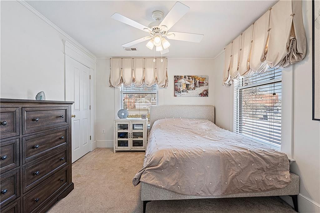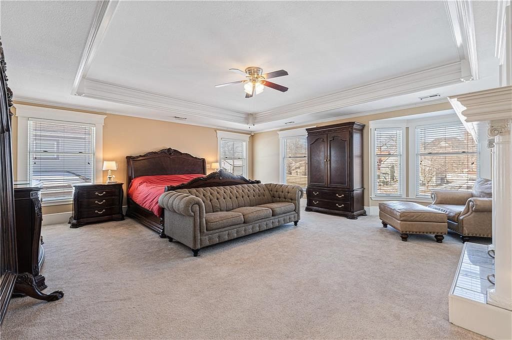 This master bedroom offers a generous and open layout, highlighted by a large, tufted sofa positioned at the foot of a dark wood, ornately carved bed with a bold red bedspread. The room features a neutral beige carpet that complements the soft cream walls and white trim, creating a warm and inviting atmosphere. Natural light floods through multiple large windows framed with white molding, adding brightness and airiness. Additional dark wood furniture, including nightstands and a tall dresser, contributes to the classic and elegant aesthetic. A cozy seating area by the windows with a matching armchair and ottoman offers a perfect spot for relaxation. Architectural details like the tray ceiling with crown molding and a ceiling fan add refined character to the room.