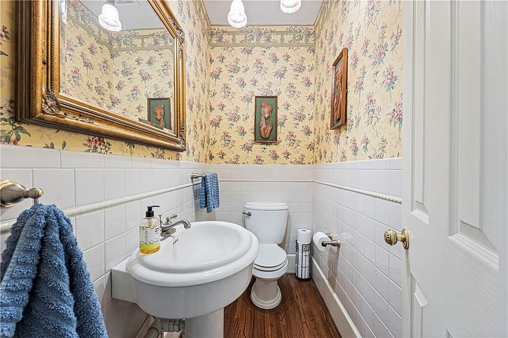 This intimate powder room features classic design elements with a half-wall of glossy white subway tiles topped by a delicate molding that complements the floral wallpaper above. Warm wood flooring adds richness and contrasts softly with the predominantly cream and pastel hues of the walls. A vintage-inspired pedestal sink sits neatly beside a traditional white toilet, creating a compact yet functional layout. The golden-framed mirror above the sink adds an elegant touch, enhancing the sense of space. Small decorative art pieces and blue towels introduce subtle pops of color, emphasizing a cozy, timeless aesthetic.