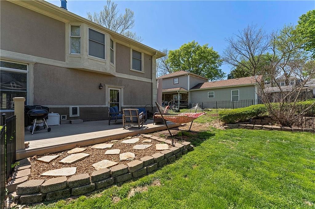 This outdoor space features a raised wooden patio attached to the back of the house, painted in neutral taupe and stone accents. The patio offers a comfortable seating area with cushioned chairs and a black charcoal grill, perfect for casual gatherings. Adjacent is a hammock suspended on a metal stand, inviting relaxation. Surrounding the patio is a small mulched garden bed with natural stone pavers arranged in an organic pattern, bordered by stacked bricks. The lush green lawn extends from the garden area, enclosed by a black metal fence. Mature trees and shrubs complete the inviting backyard ambiance.