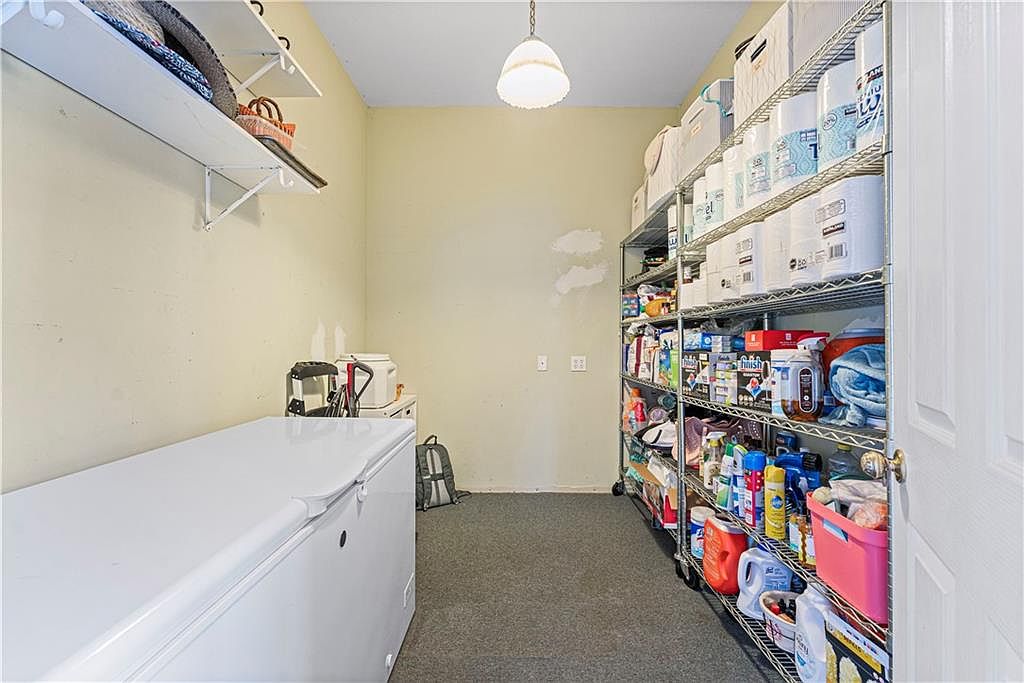 This compact storage room is designed for organization and utility. Against one wall, a large white chest freezer provides ample cold storage, complemented by a sparse shelf above it holding baskets and containers. The opposite wall features a tall, metal shelving unit stocked with household essentials such as paper towels, cleaning supplies, and pantry staples, all neatly arranged for easy access. The beige walls and muted carpet flooring create a neutral backdrop, while a simple pendant light centered on the ceiling offers practical illumination. The door to the room is white with a brass knob, maintaining a clean and functional aesthetic.