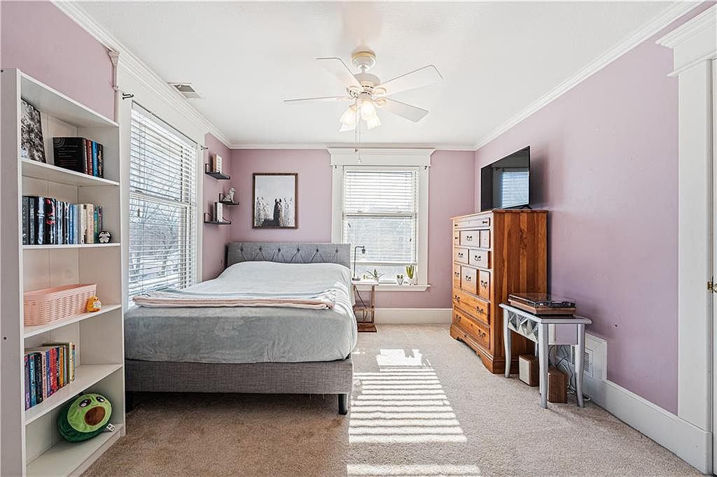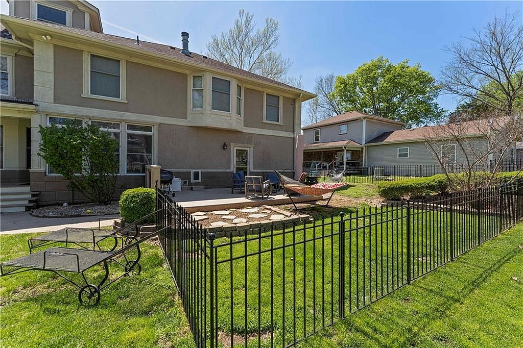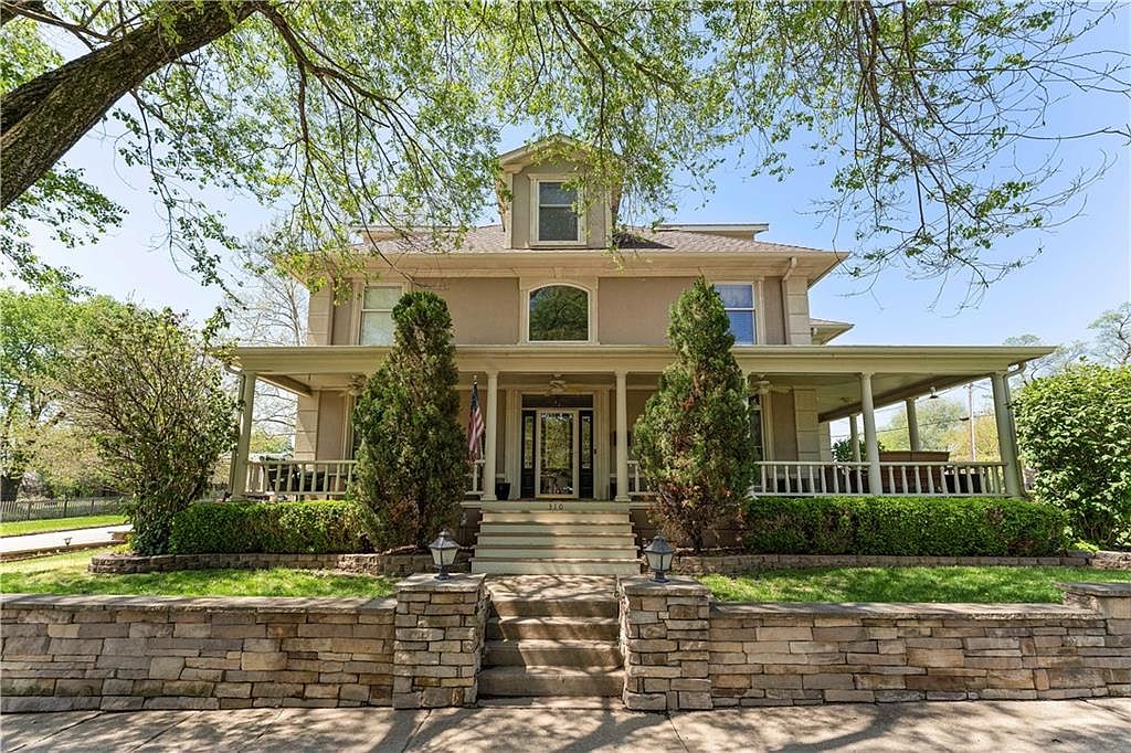 This stunning 3-story home in historic downtown Paola, Kansas, is a beautiful blend of timeless architectural style and modern luxury. Originally a century-old estate, the house underwent a complete rebuild in the 1990s, allowing it to maintain its historic charm while eliminating the typical concerns of an older home. The exterior features a classic stucco finish with detailed crown molding and a welcoming wrap-around front porch, all sitting elegantly on a large double corner lot with an oversized 2-car garage. Inside, the craftsmanship is exceptional, highlighted by extensive crown molding, stately columns, and gleaming hardwood floors throughout. The kitchen is a standout feature, equipped with custom cabinets, granite countertops, stainless steel appliances, and an elaborately decorated ceiling, perfect for culinary enthusiasts and entertaining alike. The home includes practical conveniences such as a huge laundry/mudroom and a second rear staircase for smooth daily living. The upper levels offer luxurious comfort with a primary suite that serves as a tranquil retreat, complete with a cozy sitting area featuring a bay window and a fireplace. The spa-like primary bathroom boasts a steam shower, clawfoot tub, and an elegant chandelier. The third floor presents a versatile multi-purpose room with a wet bar, ideal for hosting gatherings and celebrations. Recent updates enhance the home’s appeal, including new carpet, fresh paint, a new HVAC system, and a newly built deck. The sellers are also currently replacing the roof and making repairs to the exterior stucco, ensuring the property is move-in ready. Listed at $500,000, this majestic home offers expansive living space with modern amenities on a spacious plot, making it a rare find in the charming city of Paola, KS.