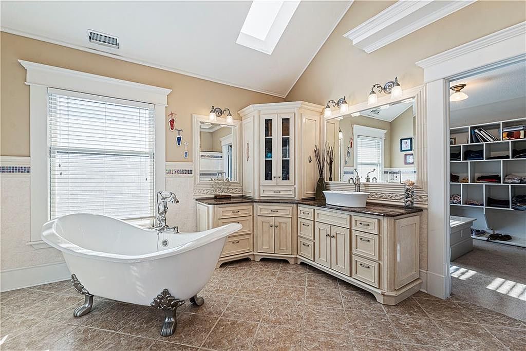 This bathroom features a classic clawfoot tub with elegantly detailed silver feet positioned near a large window with white blinds, allowing natural light to fill the space. The vanity area includes a corner cabinet with multiple drawers and glass-paneled upper doors, topped with a rich wood countertop. Two large mirrors framed with decorative molding are mounted above the counter, each illuminated by matching twin light fixtures. The walls are painted a warm beige complemented by tiled floors in a neutral tone, lending a cozy yet sophisticated ambience. An adjoining walk-in closet with organized shelves is visible through a doorway, suggesting ample storage and functional design.