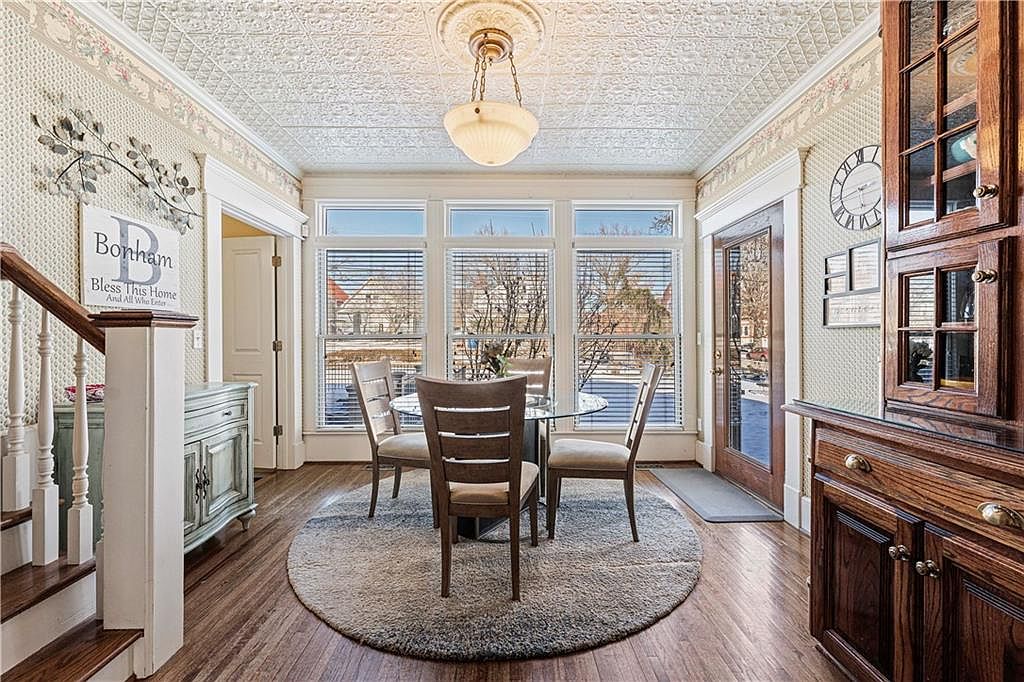 This cozy breakfast nook features a round glass-top table surrounded by four cushioned wooden chairs, centered on a plush circular area rug that anchors the space. Large windows with white trim flood the room with natural light, showcasing a view of the outdoors while brightening the neutral-toned interior. The walls display a subtle textured wallpaper with a decorative border near the ceiling, complementing the vintage-style tin ceiling with an elegant central light fixture. Warm wooden flooring flows seamlessly beneath classic white woodwork, including a staircase banister, built-in cabinetry, and an inviting wooden door with glass panels.