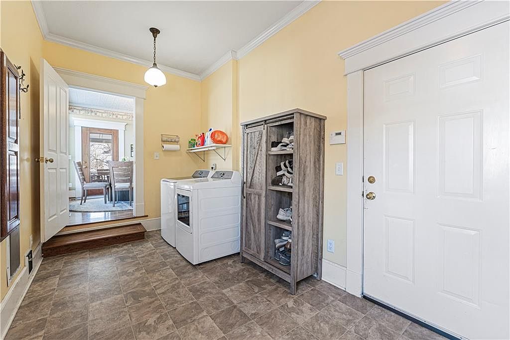 This spacious laundry room features a warm, pale yellow paint that complements the neutral, patterned vinyl flooring. A white washing machine and dryer sit side by side beneath a simple white wall shelf holding detergent and cleaning supplies. Adjacent to the appliances is a rustic wood storage cabinet with open shelves displaying shoes, adding a touch of farmhouse charm. A white-paneled door with brass hardware leads outside, while a set of wooden steps ascends into a bright dining area visible through a doorway, highlighting smooth white trim and crown molding throughout for a crisp, classic look.
