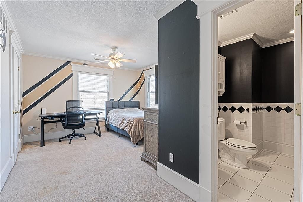 This bedroom offers a cozy and functional layout, featuring a desk and ergonomic office chair positioned by two large windows which allow natural light to fill the space. The wall design includes bold diagonal stripes in beige and dark navy against a light backdrop, adding a modern geometric accent. Neutral carpeting provides warmth underfoot, complemented by white trim and crown molding along the ceiling. The bed, with a padded headboard, faces a wooden dresser. Adjacent to the bedroom, a bathroom features glossy white tiles with a diamond-patterned black tile border, creating a sharp contrast with the darker painted upper walls, enhancing the contemporary feel of the connected spaces.