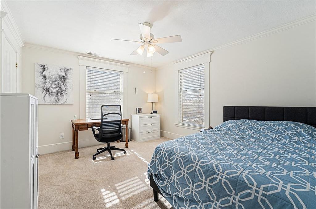 This bright bedroom features a calming and neutral palette, with soft beige carpeting complementing the off-white walls and trim. Natural light floods the space through two large windows framed with classic molding. A spacious bed with a dark upholstered headboard contrasts nicely against the lighter walls, dressed in a blue geometric patterned comforter that adds subtle color and pattern. In one corner, a wooden desk and black mesh office chair create a dedicated workspace, accented by a black-and-white elephant artwork above. A white chest of drawers and a standing lamp provide storage and warm lighting, while a ceiling fan adds functional comfort.