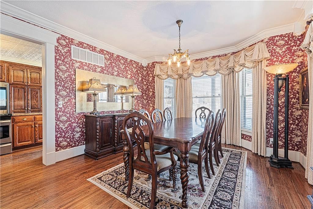 This classic dining room features rich, dark wood furniture with a large rectangular table and intricately carved chairs. The walls are covered in deep red floral wallpaper, adding warmth and vintage charm, complemented by cream-colored, layered window treatments that allow natural light to softly filter through the bay windows. A traditional patterned rug anchors the dining set on polished hardwood floors. Decorative crown molding and generous baseboards highlight the room’s architectural details. Lighting is provided by an elegant chandelier and matching lamps on a sideboard, blending functionality with timeless style for an inviting dining atmosphere.