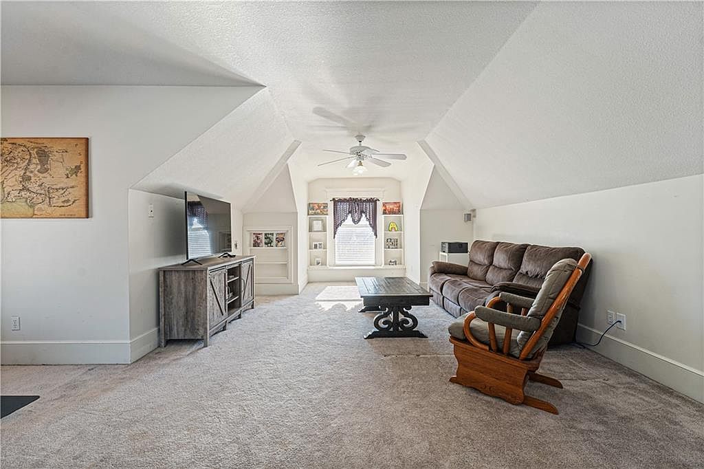 This attic living area features sloping ceilings that create an intimate, tucked-away feel. Neutral tones dominate the space, with light beige carpeting and soft white walls enhancing brightness. Furnishings include a plush, dark brown sectional sofa paired with a matching cushioned wooden rocking chair, emphasizing comfort. A dark wooden coffee table with ornate legs sits centrally, while a rustic gray entertainment console supports a flat-screen TV against one angled wall. Built-in white shelves flank the window at the room’s end, framed by a valanced curtain that softens incoming natural light, adding a cozy ambiance.