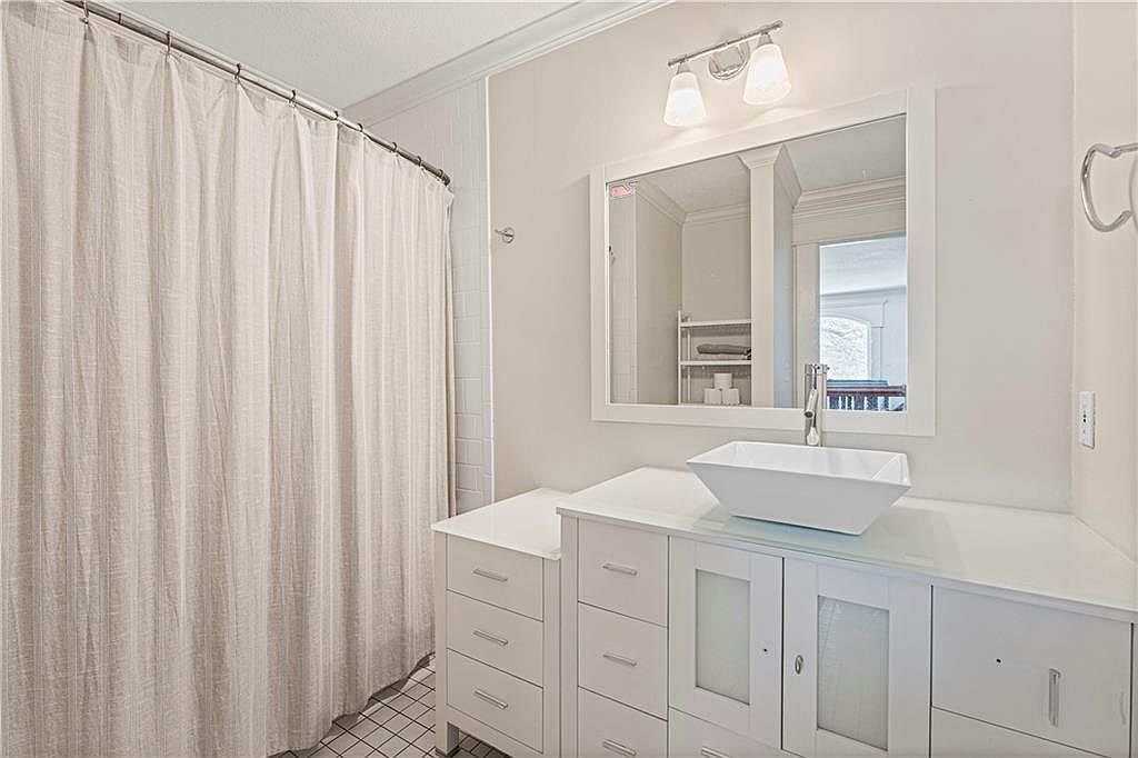 This bathroom features a clean, contemporary design with a neutral color palette dominated by whites and soft creams. A large rectangular mirror above the vanity enhances the space by reflecting light and adding a sense of openness. Below the mirror, the sleek white countertop hosts a modern vessel sink paired with a minimalist chrome faucet. The vanity offers ample storage with multiple drawers and cabinets, including frosted glass panels for subtle visual interest. To the left, a fabric shower curtain in a natural tone complements the overall calm aesthetic and conceals the bathtub area. The floor is tiled in a classic grid pattern of white with dark grout lines, adding a slight contrast and grounding the space visually. Overall, the design emphasizes simplicity and functionality combined with bright, airy elements.