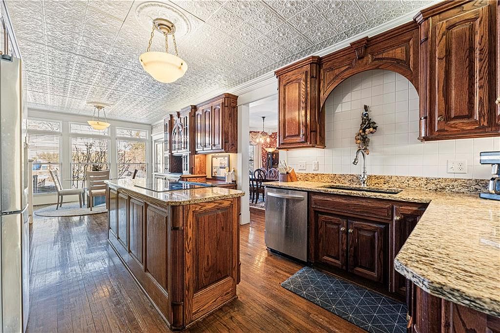 This kitchen features rich, dark wooden cabinetry with raised panel doors and intricate detailing, complementing the warm hardwood floors. The countertops are a polished granite with a gold and beige pattern that adds a luxurious touch. A central island offers additional workspace and storage, while stainless steel appliances, including a dishwasher and refrigerator, provide a modern contrast. The backsplash behind the sink is composed of clean, white tiles, enhancing the classic look. Natural light streams through large windows in the adjoining breakfast nook, furnished with a round table and chairs. The white embossed tin ceiling with traditional light fixtures adds an elegant vintage charm to the space, making it both functional and visually appealing.