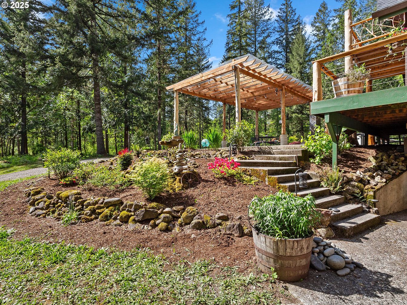 This serene outdoor area features a raised patio with a rustic wooden pergola providing partial shade, ideal for relaxation or intimate gatherings. Stone steps lead up from a concrete pathway, bordered by a charming rock retaining wall. The garden beds are adorned with a variety of green shrubs and splashes of vibrant flowers, adding color and texture to the earthy, natural landscaping. Potted plants, including one in a weathered wooden barrel, enhance the organic feel. Surrounded by tall evergreen trees, this space blends seamlessly into its forested environment, creating a peaceful retreat with rustic charm.