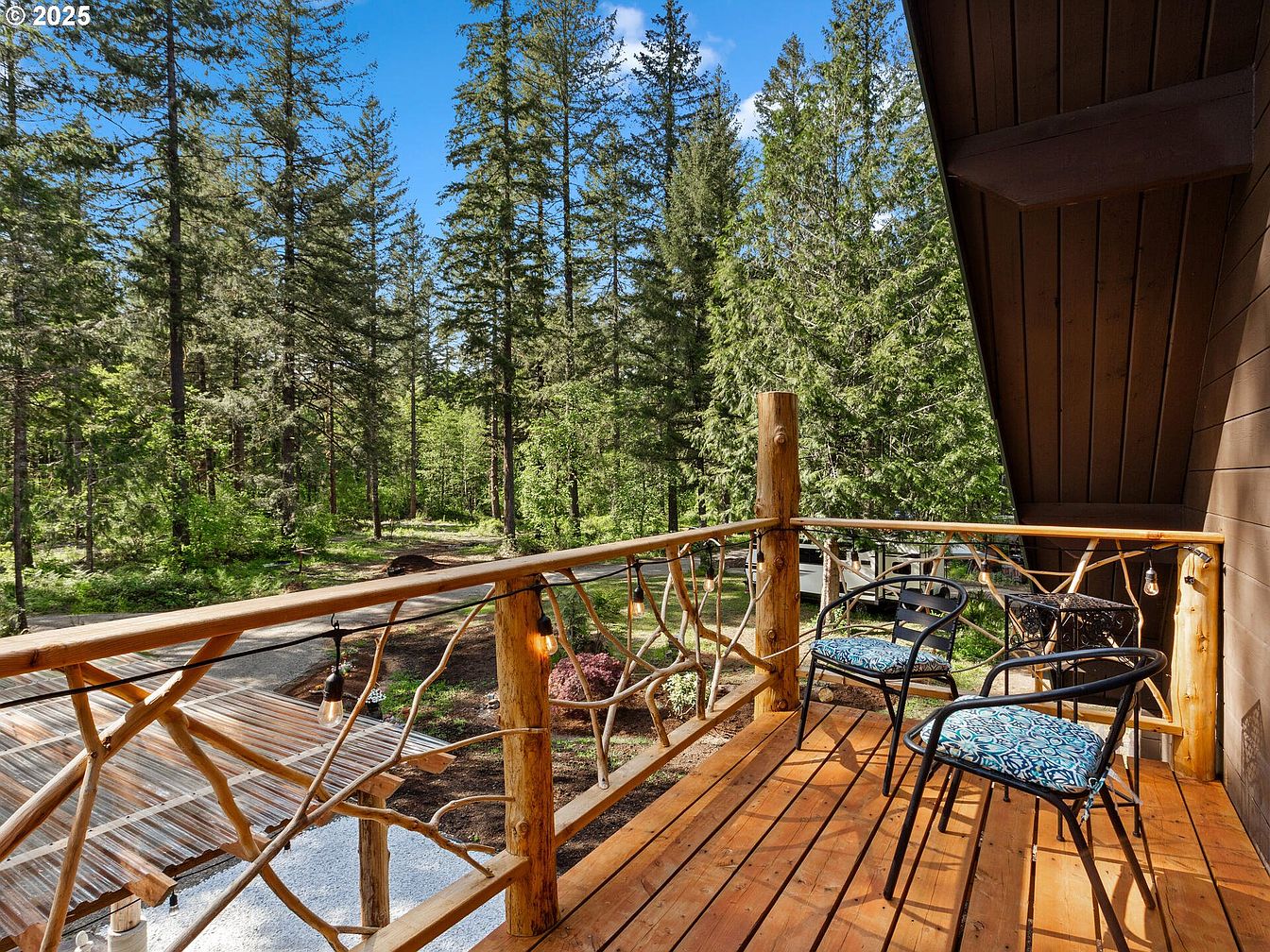 This charming balcony offers a cozy outdoor seating space surrounded by towering pine trees, ideal for enjoying a peaceful retreat in nature. The wooden deck flooring complements the rustic balustrade crafted from natural logs and branches, adding a handcrafted, organic feel. Two black metal chairs with blue patterned cushions provide a comfortable spot to relax, accompanied by a small ornate metal table for drinks or decor. String lights drape gently along the railing, enhancing the warm ambiance during evenings. The overall aesthetic promotes a serene connection to the tranquil forest landscape visible just beyond.