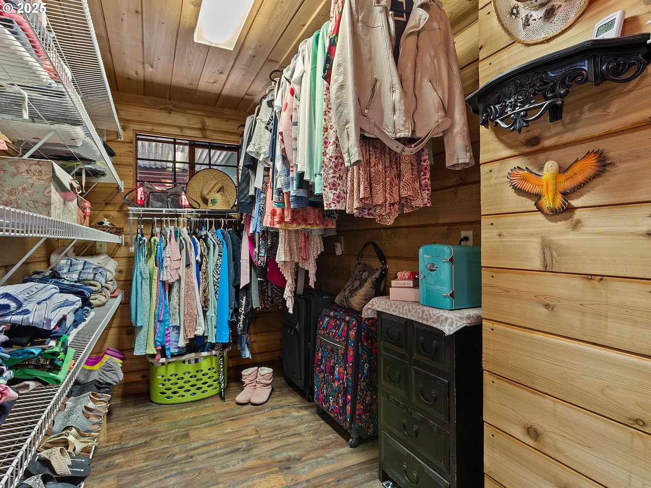 This walk-in closet features a rustic, cabin-like aesthetic with natural wood paneling covering the walls and ceiling, complemented by a warm, wood-toned floor. On the left, white wire shelving holds neatly folded clothes and shoes, offering organized storage. Clothing is hung on two parallel rods stretching from one end to the other, showcasing a colorful mix of casual and dressy garments, with additional storage baskets below. A small black chest of drawers stands on the right side, topped with a patterned cloth and a retro turquoise mini-fridge, adding a touch of personality. Decor includes a vibrant bird wall hanging and a carved dark wood shelf.