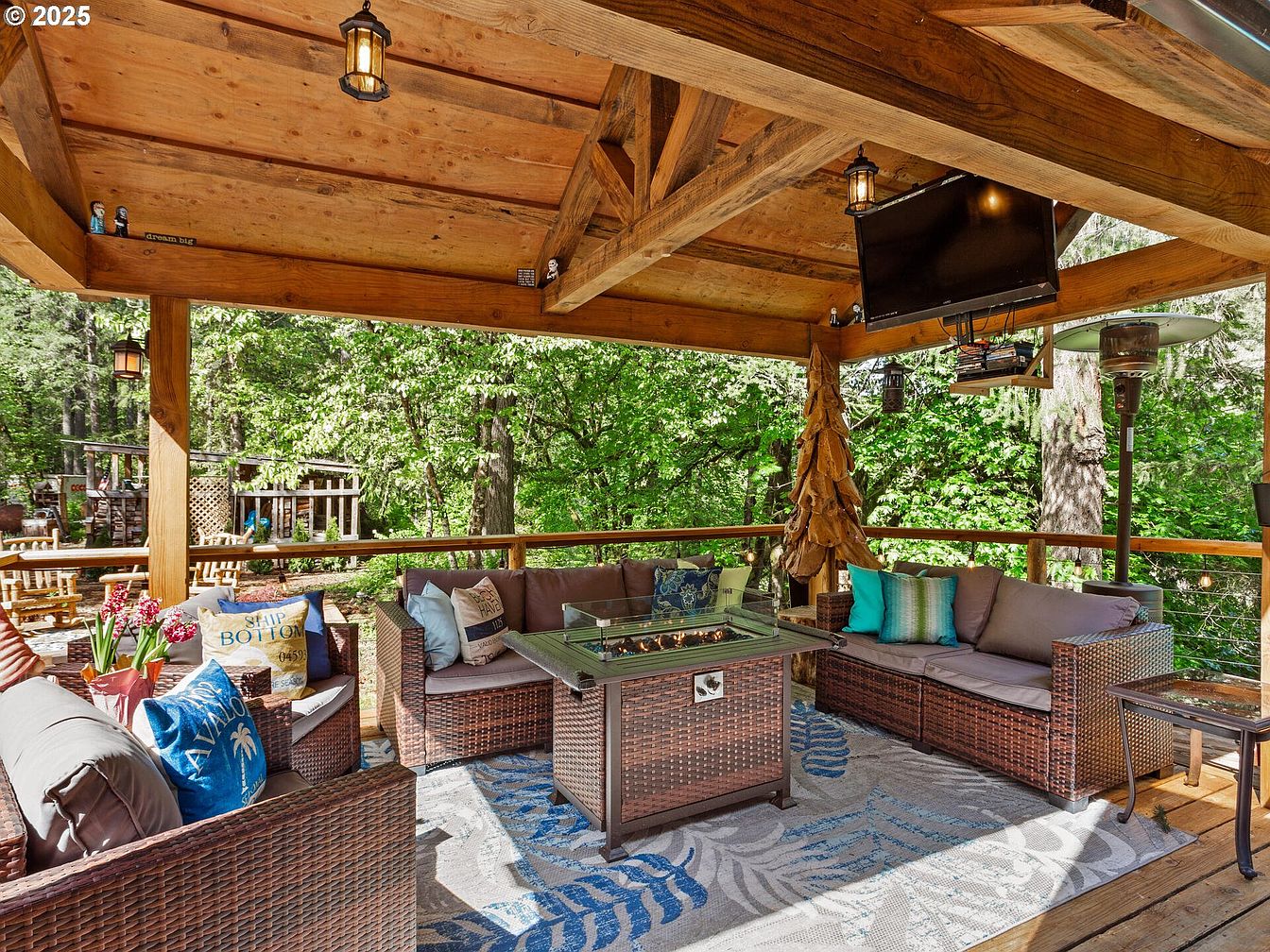 This inviting covered outdoor lounge is framed by rich natural wood beams and a rustic ceiling, blending seamlessly with the verdant forest surroundings. Comfortable woven rattan sofas with muted gray cushions encircle a central fire pit table, perfect for cozy conversations. The space is accented by a large patterned rug in shades of blue and gray, unifying the seating area. Throw pillows add personalized charm with coastal and nature-inspired prints. Ambient lantern-style lighting and a mounted flat-screen TV enhance functionality while the open-air design maintains close connection with nature.