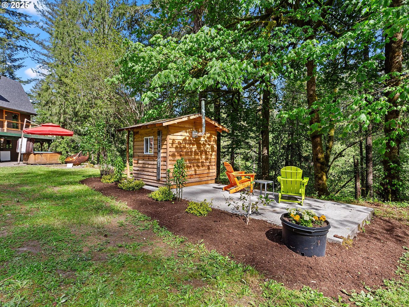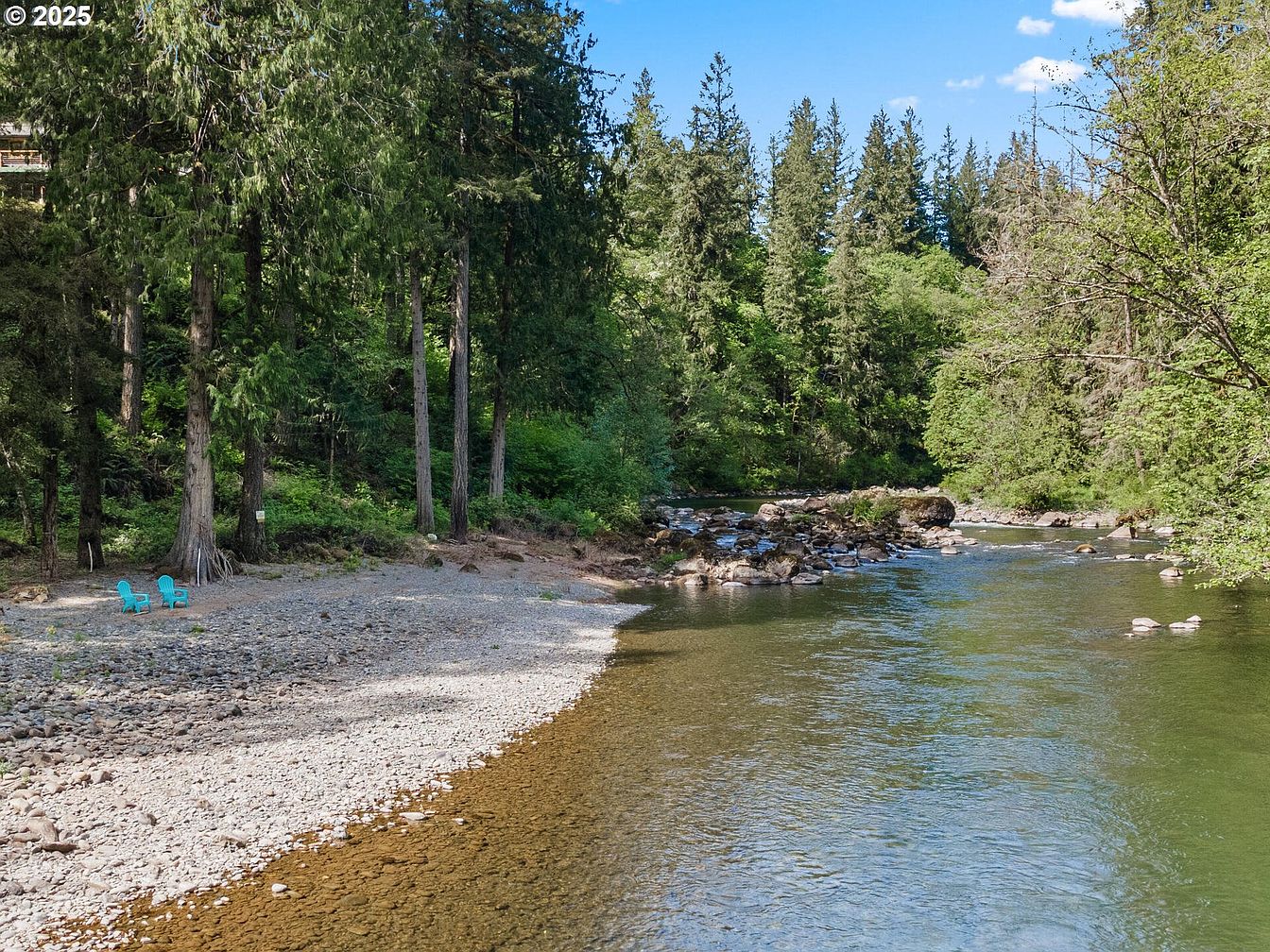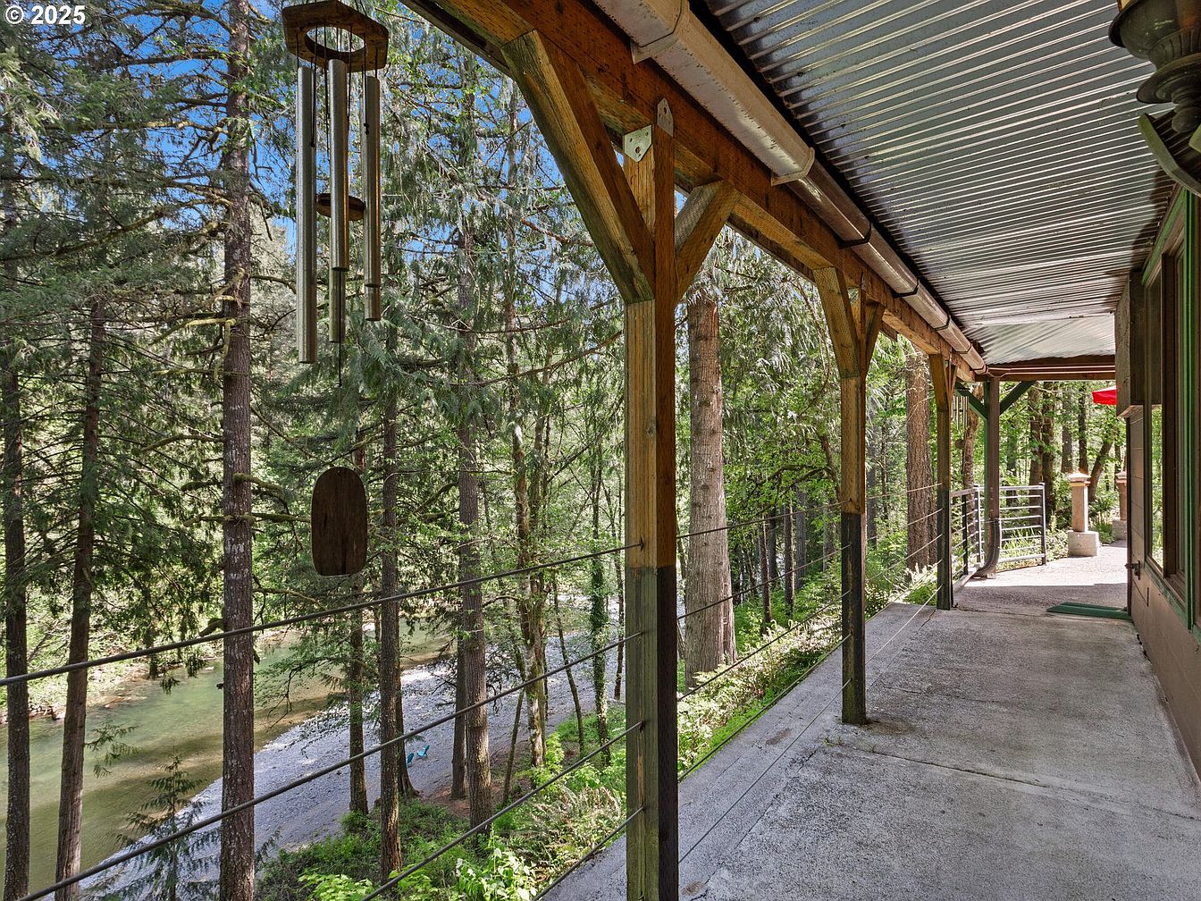 This peaceful covered porch extends along the side of the home, featuring exposed wooden beams supporting a corrugated metal roof that adds a rustic touch while ensuring durability. The flooring is concrete, providing a sturdy outdoor space that complements the natural forest surroundings. Wire railing enhances safety without obstructing the serene view of tall evergreen trees and a gently flowing river below. A prominent wind chime hangs from the ceiling, adding an element of gentle sound to the tranquil environment. The porch invites relaxation and appreciation of nature’s beauty.