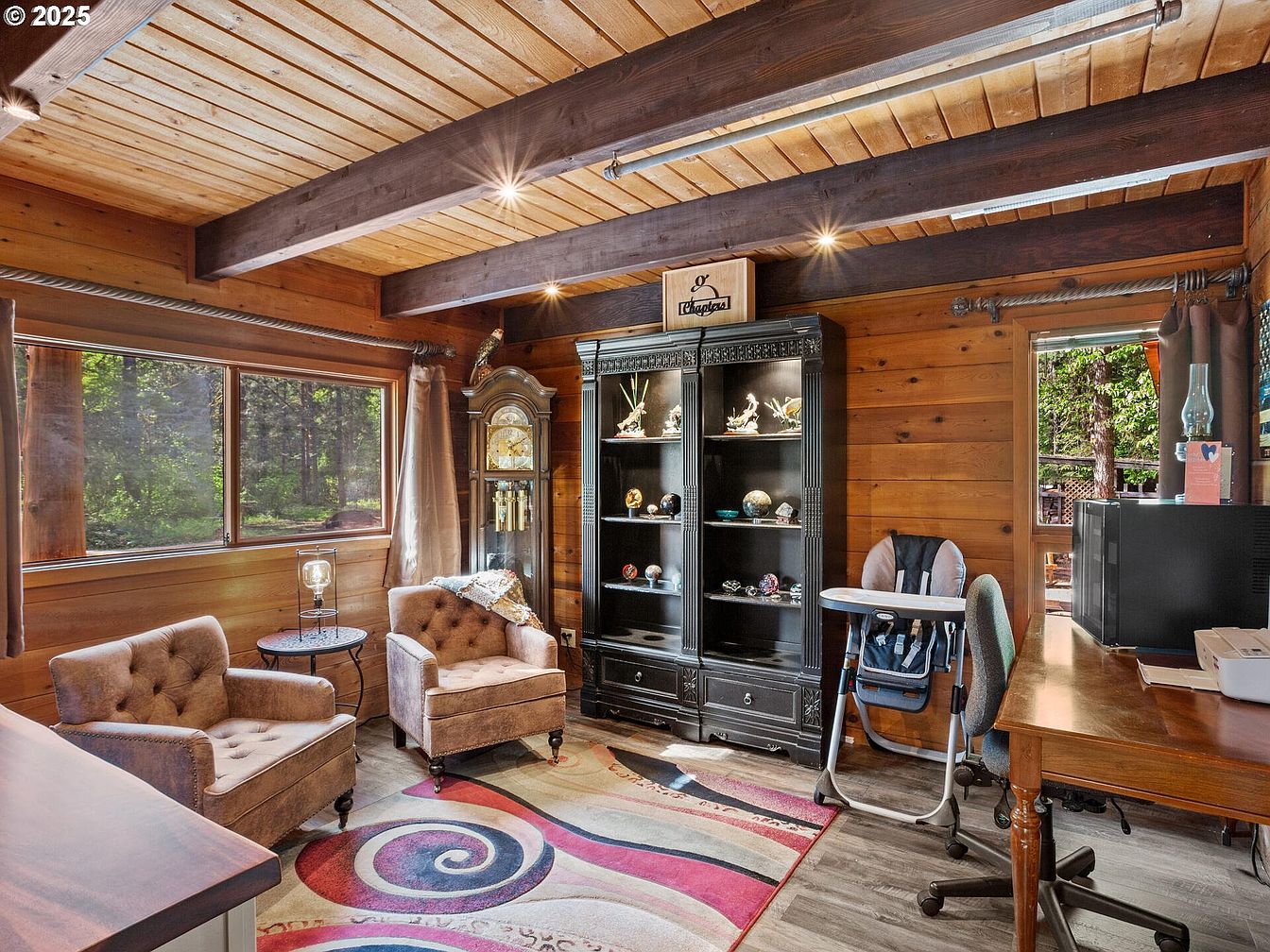 This intimate space blends rustic charm with functional comfort, designed as a cozy den and office nook. The walls and ceiling are clad in warm-toned natural wood planks, accented by exposed dark wooden beams overhead, creating a cabin-like ambiance. A large window floods the room with natural light, showcasing forest views, complemented by neutral-toned curtains. Two tufted, beige armchairs sit on a colorful abstract rug with swirling patterns, inviting relaxation. A tall, ornate black display cabinet holds decorative items, while the adjoining wooden desk supports a microwave and office chair. A tall grandfather clock adds timeless character to this versatile retreat.