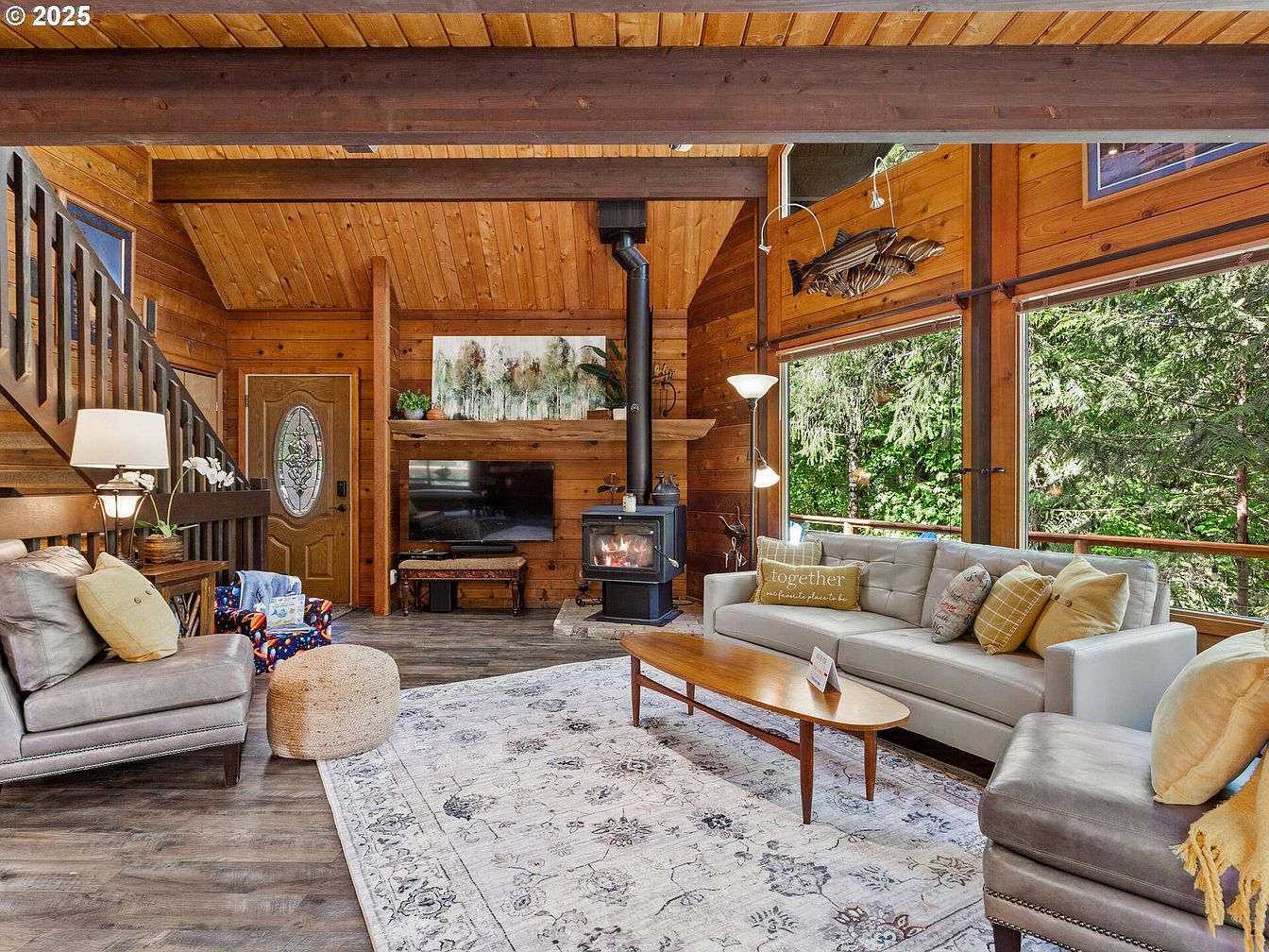 This inviting living room features rich wooden walls and vaulted ceilings accented by exposed dark beams, bringing a warm, rustic charm. A large window wall offers stunning forest views that flood the room with natural light. Furnishings include a soft cream-colored sofa adorned with cozy, patterned pillows and a light gray chaise lounge with yellow cushions. A vintage-style wood stove, set against a thick mantel with nature-inspired artwork, adds to the ambiance. The floor lamp, patterned area rug, and wooden coffee table complete a perfect blend of comfort and nature-inspired aesthetics in this cabin retreat.