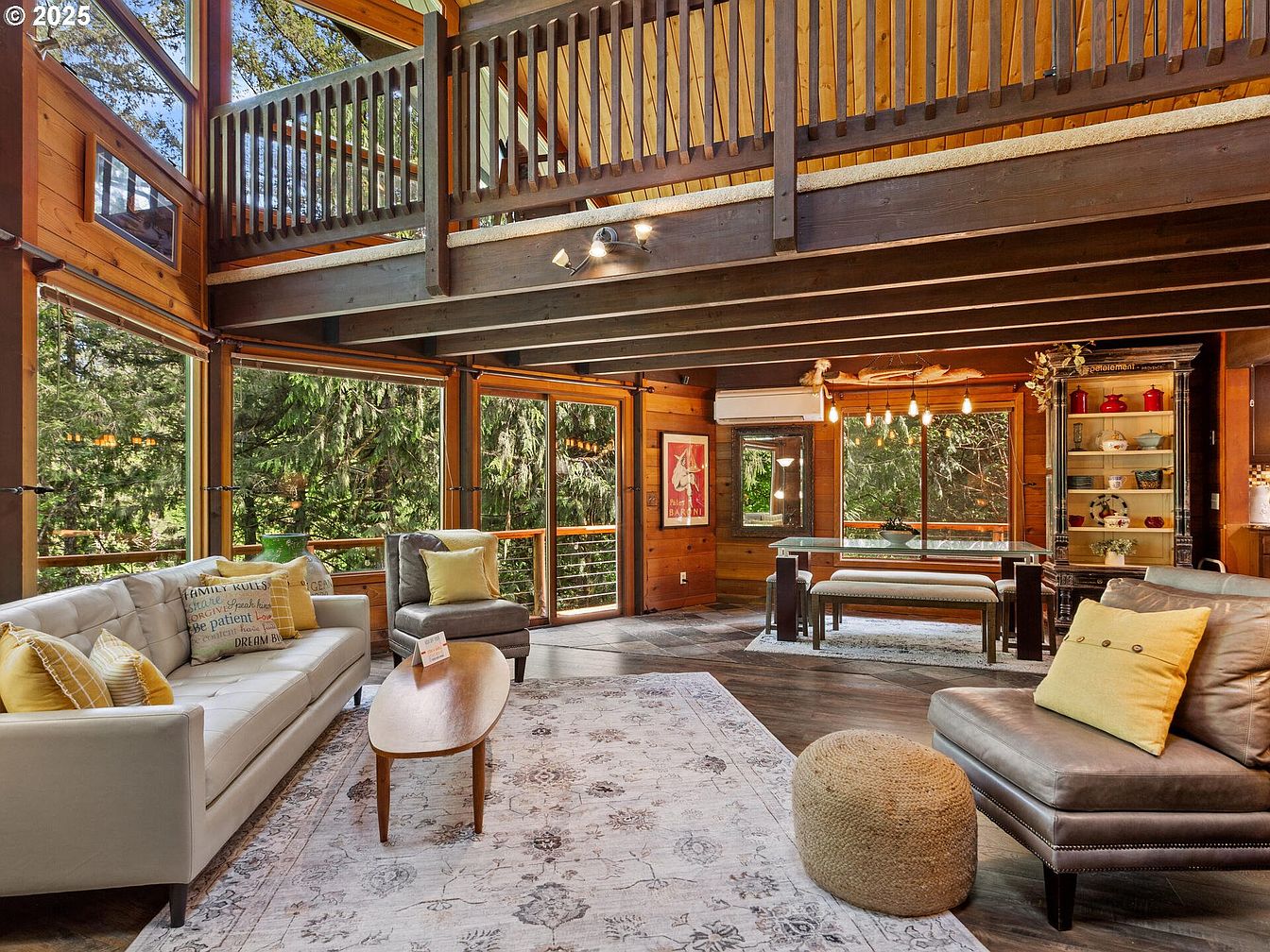 This spacious living room opens to a dining area under a vaulted wooden ceiling with exposed dark beams and a loft railing above. The walls are clad in warm wood paneling, complementing the large windows that flood the space with natural light and offer lush forest views. Furnishings include a cream leather sofa adorned with yellow and neutral pillows, a matching leather armchair, and a mid-century modern wooden coffee table resting on an intricately patterned area rug. The dining area features a glass-top table with cushioned benches and a statement light fixture, enhancing the rustic yet cozy ambiance.
