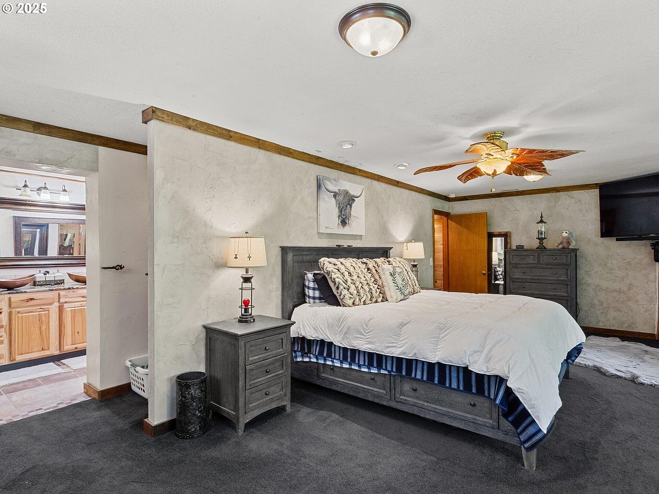 This master bedroom offers a cozy yet rustic atmosphere characterized by textured, off-white walls bordered by wooden trim that adds warmth. The centerpiece is a large, dark gray wooden bed frame with matching nightstands, topped with neutral-toned lamps providing soft ambient lighting. The bed is neatly made with a white comforter and layered with chunky knit and patterned decorative pillows, complemented by a plaid bed skirt. A ceiling fan with leaf-shaped blades creates unique character overhead. The space extends to a doorway leading to a bathroom with natural wood cabinetry, continuing the warm, earthy aesthetic found throughout.