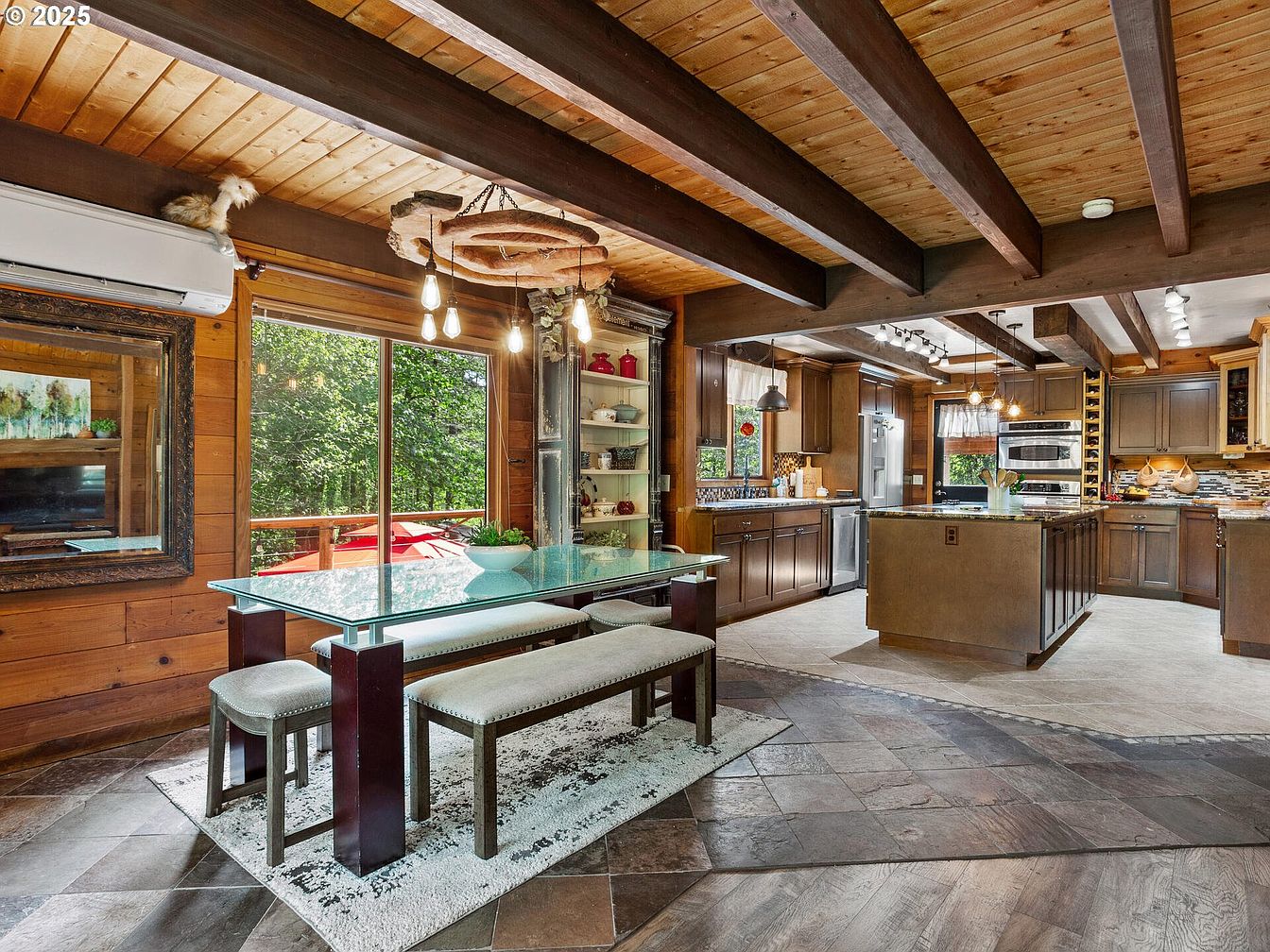 This spacious dining area flows seamlessly into the kitchen, showcasing a warm, rustic design. The ceiling features exposed wooden beams with a natural wood plank finish, contrasted by dark, sturdy beams. The dining table boasts a modern glass top supported by dark wooden legs, paired with beige upholstered benches and stools resting on a muted patterned rug. Large windows flood the space with natural light and offer views of lush greenery outside. The kitchen has rich dark wood cabinetry, granite countertops, and a central island with contemporary pendant lighting. The tiled floor combines earthy tones for a comforting, cohesive aesthetic.