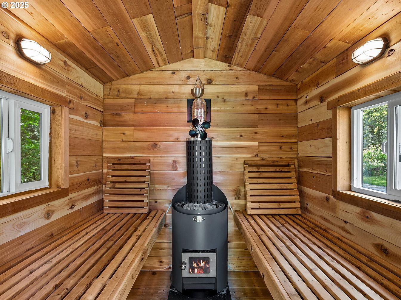 This cozy sauna features natural wood paneling on the walls, ceiling, and benches, creating a warm, inviting atmosphere. The symmetry of the two wooden benches facing each other enhances the intimate space, while their slatted design promotes comfort and ventilation. A sleek black stove with a glass door sits centrally against the back wall, housing glowing embers. Above the stove is a metal exhaust pipe with a fan for heat circulation. Two small, framed windows let in natural light and allow views of the lush greenery outside, balancing privacy and openness beautifully.