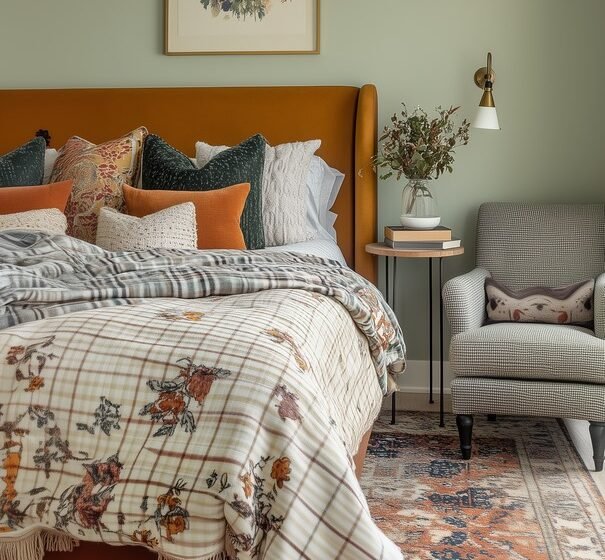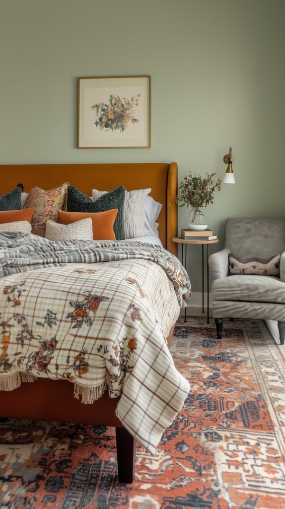 Cozy Eclectic Bedroom with Plaid and Earth Tones