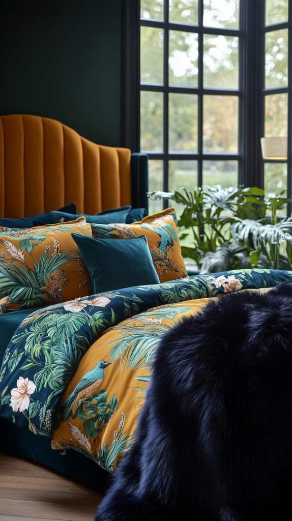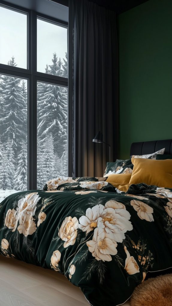 This bold winter bedroom features a striking dark floral comforter paired with a deep green accent wall. The combination of moody tones and rich textures creates a luxurious, dramatic feel, perfect for those who want a unique winter bedroom.