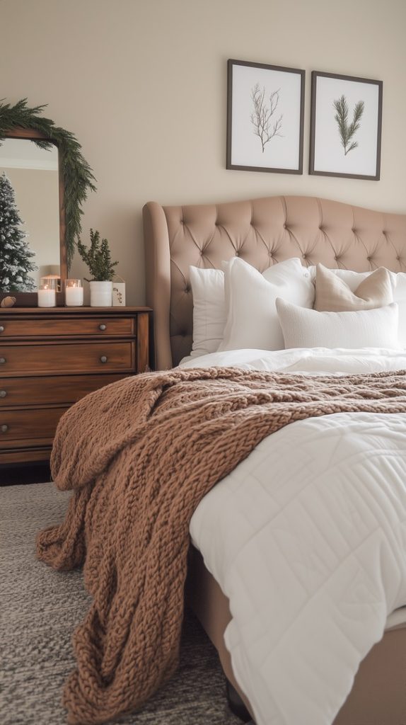 This farmhouse-style winter bedroom features a beautiful garland draped over the headboard, adding a festive touch to the cozy space. Neutral linens and throw blankets complement the wooden furniture, while a small Christmas tree adds just the right amount of holiday charm.