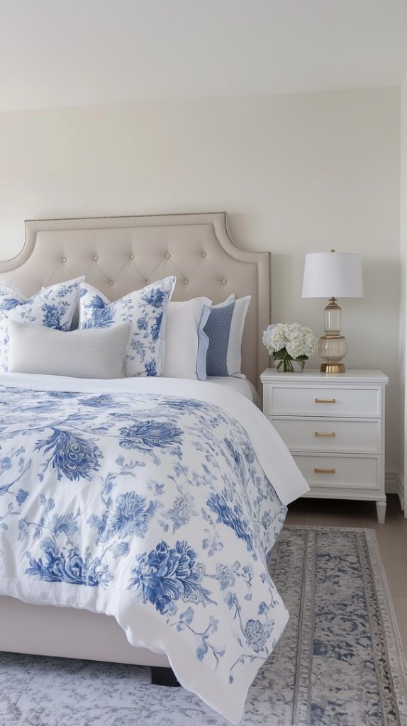 This French country-inspired bedroom embraces winter with a beautiful blue toile bedding set and light, airy decor. The rustic wood nightstand adds warmth, while the soft blue tones evoke a serene, calming atmosphere.