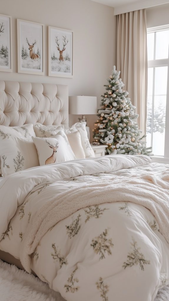 This winter bedroom exudes elegance with its soft gold and white palette. The tufted headboard and plush bedding provide ultimate comfort, while the gold accents add a touch of sophistication. Ideal for creating a refined winter sanctuary.