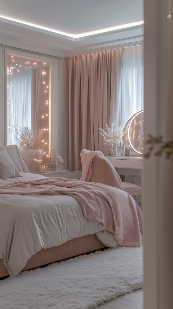 Soft Blush Winter Bedroom with Twinkling Lights