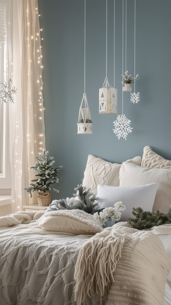 This bedroom captures the magic of winter with its cool blue walls and snowy decor. Soft white knits drape over the bed, inviting warmth, while mini evergreen trees and hanging lanterns give a festive, nature-inspired touch. The delicate snowflake ornaments and twinkling fairy lights add a serene, wintry charm, perfectly balancing the cozy and crisp elements. The layering of soft textures like chunky blankets and knit pillows ensures that this room feels as comforting as it does seasonally enchanting, making it the ideal winter retreat.