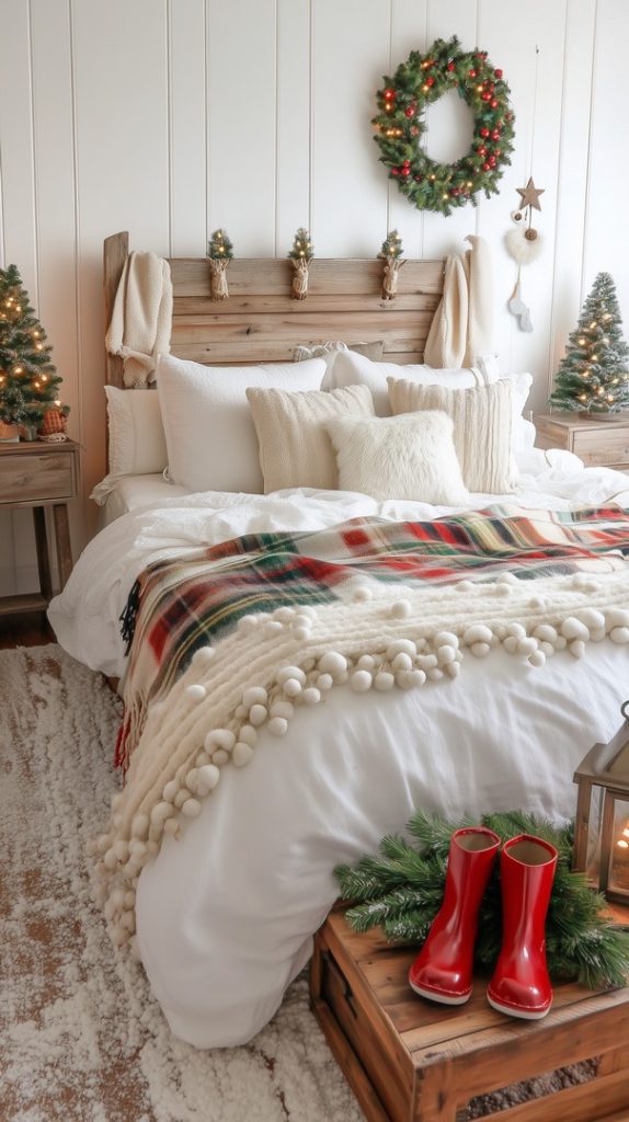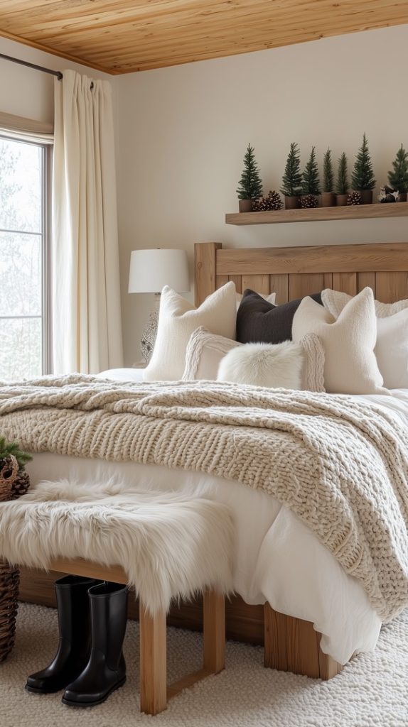 This cozy bedroom features a warm, rustic design with a wooden headboard and soft, chunky knit blankets. The neutral tones of the pillows and bedding create a tranquil and inviting atmosphere, perfect for a peaceful winter morning. Small pine trees on the shelf above the bed add a festive touch, while the fur-covered bench and rain boots complete the cozy winter look.