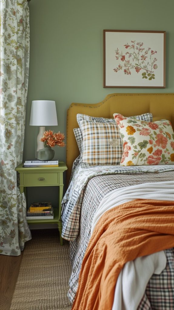 Bright and cheerful, this bedroom combines floral patterns and a vibrant green accent wall with cozy winter bedding. The plaid pillows and orange blanket create a layered, cozy feel, while the floral artwork and curtains add a fresh touch. This setup is perfect for those looking to bring a bit of nature and warmth into their winter bedroom decor.