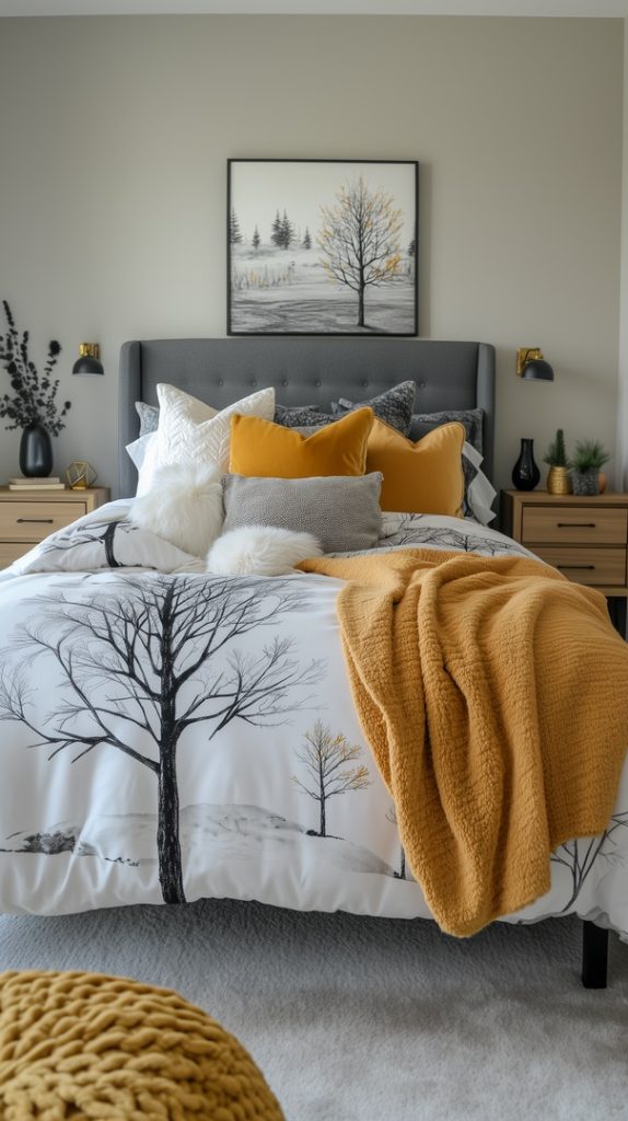 Simplicity meets elegance in this minimalist winter bedroom. The neutral bedding is accented by pops of mustard yellow in the pillows and throw blanket, adding warmth to the space. A serene tree art piece hangs above the bed, complementing the wintery vibe with a calm, nature-inspired aesthetic. This look is perfect for those who enjoy a clean, uncluttered space during the winter months.