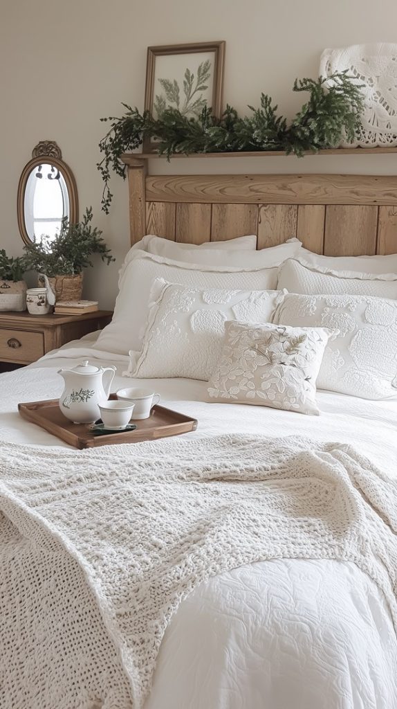 This bedroom exudes elegance and warmth with its soft, white linens and intricate, vintage-inspired headboard. Greenery above the bed and a tea tray add a touch of winter charm, creating a space that’s both inviting and serene. The mix of textures, from the crocheted blanket to the lace pillows, adds depth and comfort, making it an ideal winter retreat.
