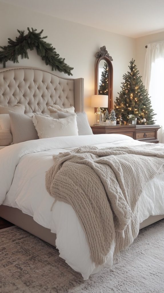A classic Christmas bedroom filled with timeless charm, featuring a tufted headboard, soft beige bedding, and traditional holiday greenery. The Christmas tree in the corner adds festive cheer, while the cozy knit blankets invite warmth and relaxation. The garland draped over the headboard completes the festive look, making this room perfect for the holiday season.