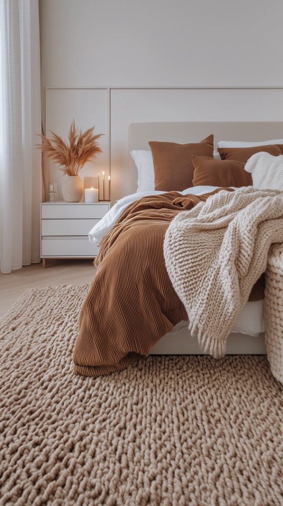 This modern winter bedroom features a warm palette of earthy tones, from the rich brown blankets to the soft cream knits. The chunky knit rug and pampas grass accents create a cozy, textured space, perfect for curling up on chilly winter days. The clean lines and minimalist decor make this room feel both modern and inviting.