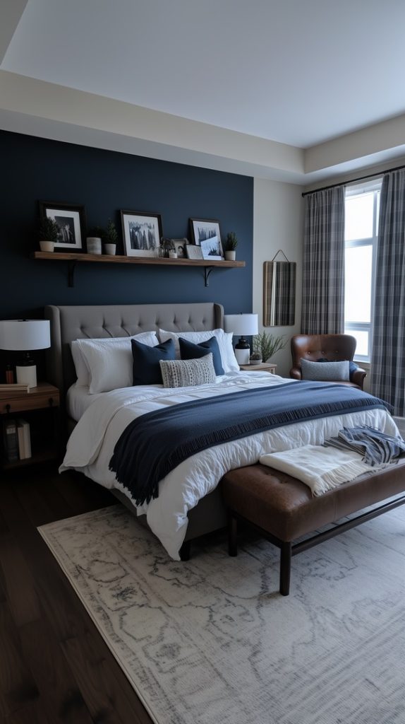 This modern winter bedroom is the perfect blend of dark sophistication and cozy comfort. The deep blue walls create a bold backdrop, while the white bedding and subtle grey tones soften the look. The simple decor, including framed art and soft throw blankets, keeps the space feeling warm and inviting for the winter season.