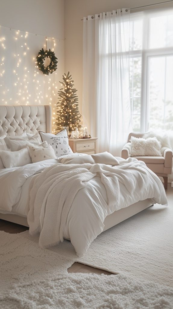 This winter bedroom features a clean, white color palette accented by faux fur throws and plush pillows. A small Christmas tree twinkling in the background adds a festive touch, while the overall minimalistic decor keeps the space serene and inviting.