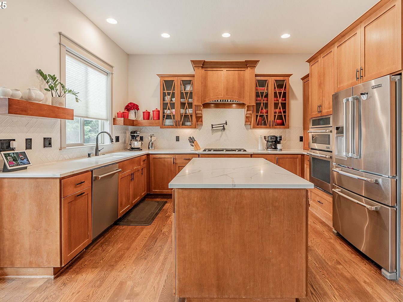 This kitchen features a warm, inviting atmosphere with rich wooden cabinetry and flooring that complement each other beautifully. A central island with a sleek white countertop offers ample workspace and adds functionality. The cabinetry includes glass-front upper cabinets with crisscross design, revealing a mix of dishes and vibrant red kitchenware, adding pops of color. Stainless steel appliances, including a refrigerator, oven, and dishwasher, provide a modern touch. White subway tile backsplash in a herringbone pattern enhances texture and light reflection. Natural light streams in through a window above the sink, accented by simple blinds and floating shelves displaying potted plants and decorative ceramics.