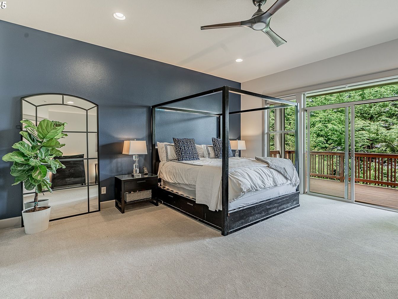 This spacious master bedroom features a striking deep blue accent wall that contrasts beautifully with soft beige carpeting and crisp white bedding. The centerpiece is a modern black four-poster bed adorned with geometric patterned pillows, flanked symmetrically by sleek black nightstands and contemporary clear glass lamps. A large, arched mirror with metal framing adds depth and complements the room’s modern aesthetic. Expansive sliding glass doors allow natural light to flood in and provide direct access to a wooden balcony overlooking lush greenery, creating a seamless indoor-outdoor connection. A ceiling fan offers functional style, balancing comfort with elegance.
